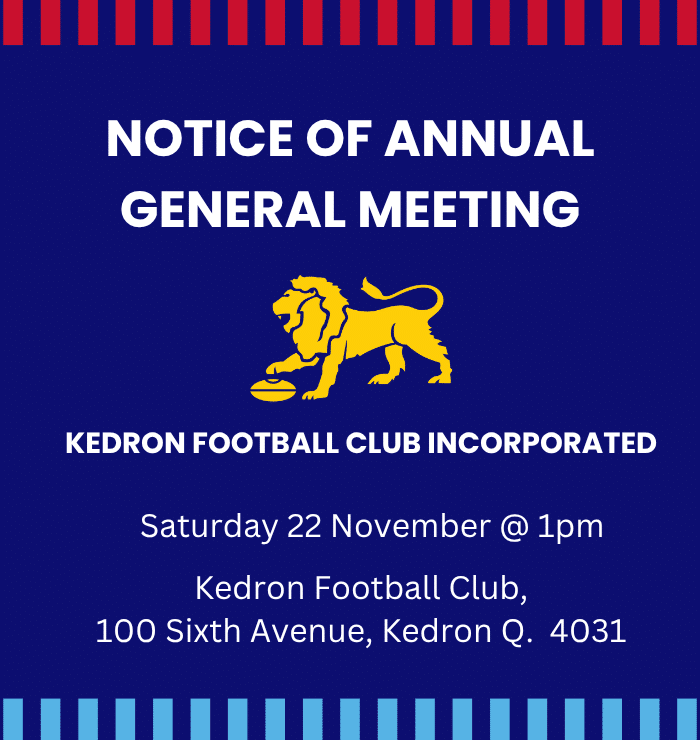 Notice is hereby given to full members and life members of the Kedron Football Club Incorporated that the ANNUAL GENERAL MEETING for the financial year ending 30 September 2025 will be held on Saturday 22nd November 2025 at the Club, 100 Sixth Avenue, Kedron, 4031 commencing 1pm.